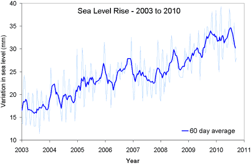 Figure 5. Global sea level rise, inverse barometer applied, seasonal signal removed (University of Colorado at Boulder).