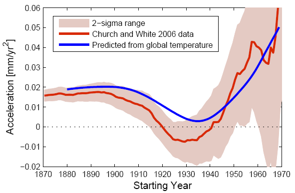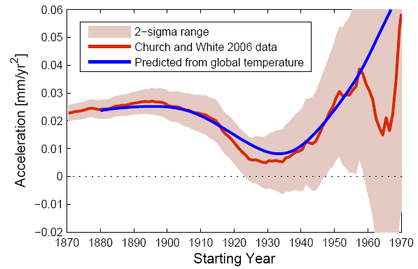 Houston & Dean use their result to question the future acceleration of sea level rise predicted byVermeer & Rahmstorf (2009) for the 21st century as a consequence of global warming. They argue that the 1930s' acceleration minimum calls into question the semi-empirical link between global temperature and global sea level proposed by us in that paper. However, it is clear they never bothered to check this, because quite the opposite is the case: our semi-empirical formula predicts this acceleration minimum, as the graph above shows. As it turns out, this is an expected outcome of the mid-20th-Century plateau in global temperature.